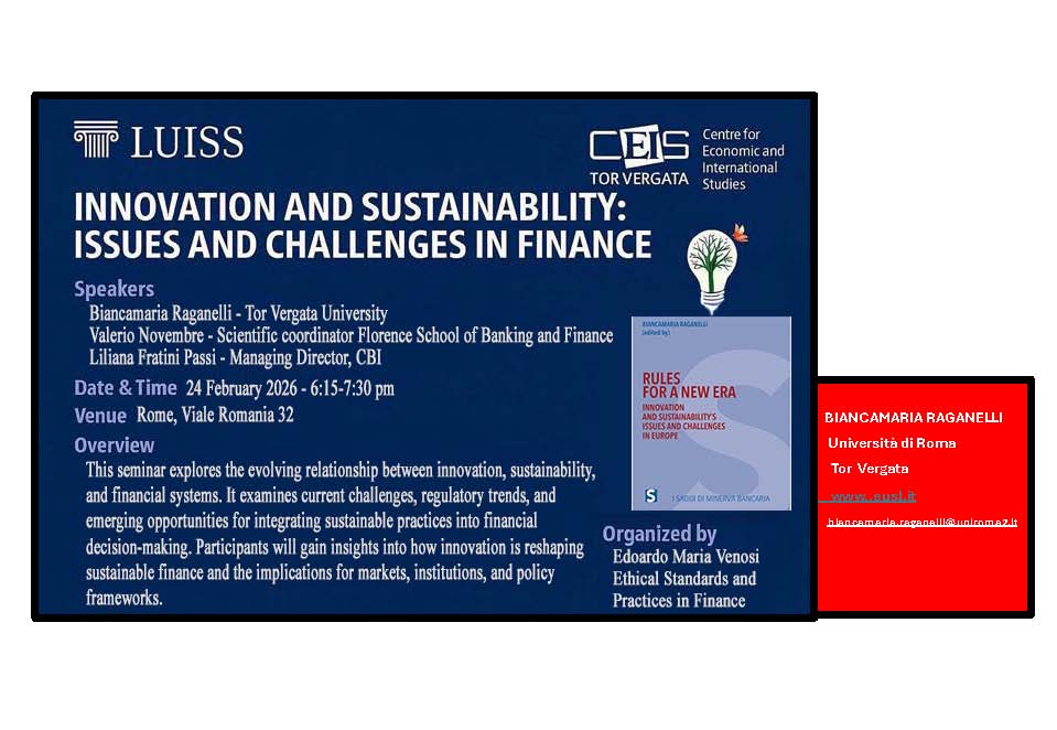 - 17 Febbraio 2025 dalle 14.00 Seminario 3h Regolamentazione finanziaria, Sostenibilità e Modelli di vigilanza: SSM e Rapporti tra BCE e NCA
